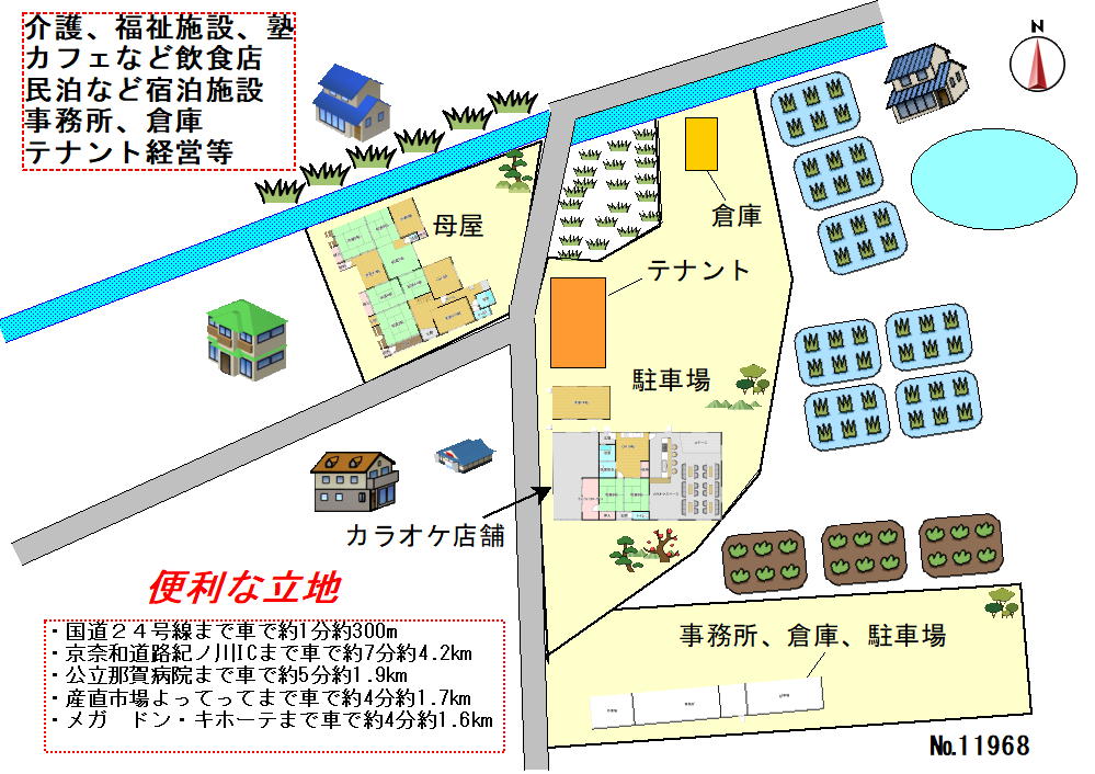 物件の立地は国道、京奈和道路に近く大阪、奈良、和歌山市内などに非常にアクセス良好です。国道沿いの病院、ホームセンター、スーパー、飲食店など車で5分圏内にあり非常に便利です。まわりはたくさんの農地が残り静かな環境の田園地帯です。バルコニーから山々が見え非常に見晴らしの良い物件です。建物は11DKの母屋、テナント、カラオケステージのあるフリースペース、事務所、倉庫があります。介護、福祉施設、塾、カフェなど飲食店、民泊など宿泊施設、事務所、テナント・倉庫経営など幅広い用途を検討することができます