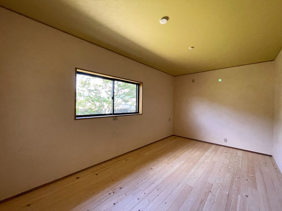 2024.10.21 リフォーム通信★からし色の天井がマッチした寝室 今日も日高町からリフォーム通信をお届けします。 窓からはお庭の木々が見えます。床は杉です。 ドアを開けると杉の香りがしますよ~♪壁は漆喰でDIYされていました(^^) 天井はからし色です。落ち着いた空間でいいですよね♪