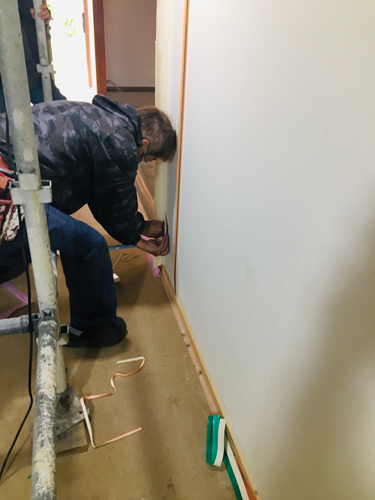 リビングのクロスを施工中。