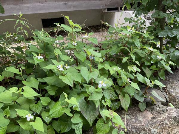 玄関庭先のどくだみの花がそよそよと上品に咲いております。