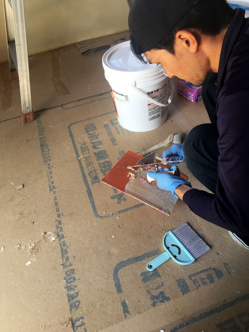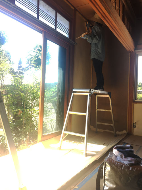 施主のI様が漆喰塗りをしていました。