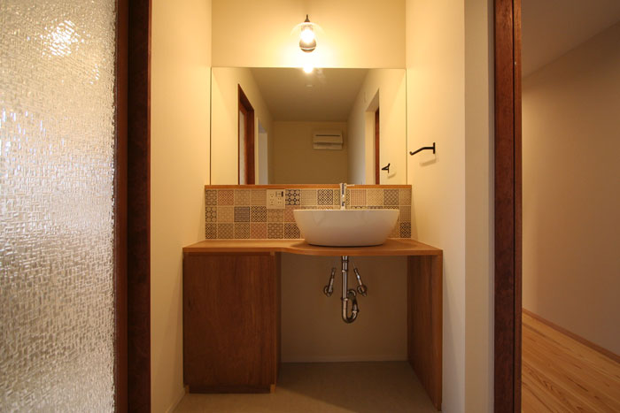 奥様のご希望のタイルを貼った洗面台です。入り口のガラスもおしゃれです。