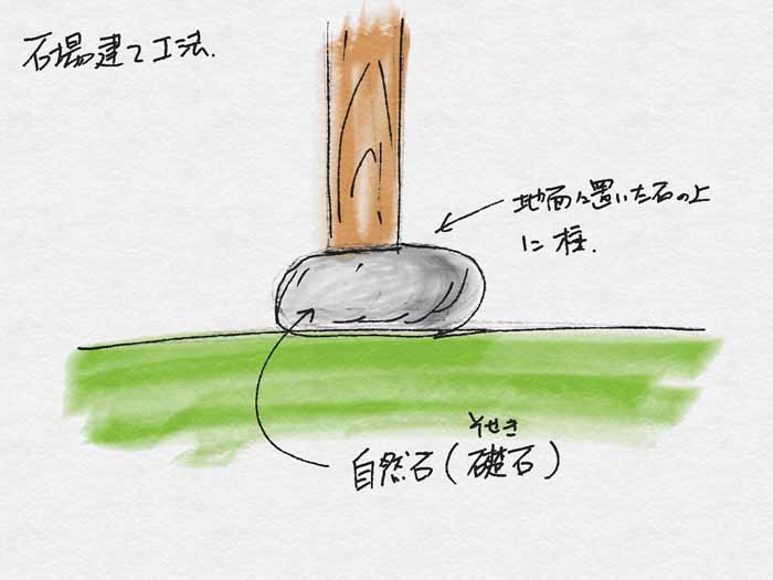 そこで地面の上に自然石をおいて、その上に柱を立てる方法がとられるようになりました。