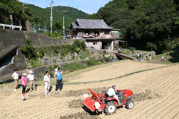 農業用トラクターの運転体験や草刈機体験。後ろに見えるのが川﨑様のお宅。鉄筋コンクリートの倉庫の上に平屋が乗った構造。