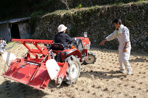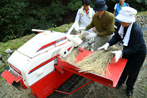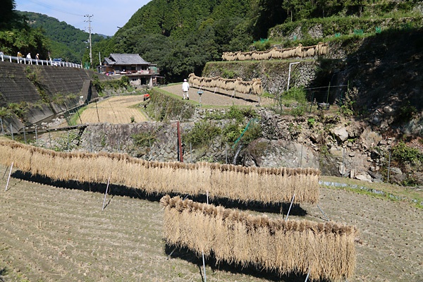段々の水田は見た目は美しいのですが、手入れが大変だそうです。油断をすると猪に石垣や畦を崩されるので補修しなくてはいけませんし、農機具を上げるのも大変。大きな田なら一気に田植えや収穫ができますが、何回にも分けて作業しなくてはいけません。