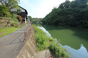 2階から眺めた「国主渕」。対岸の木々に隠れているあたりが、名前が付けられた大岩と思われます。