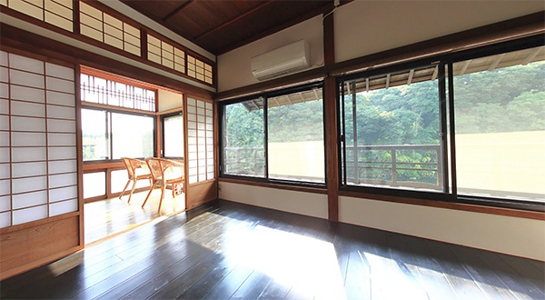 2階には和室・板の間・広縁があり、貴志川を見下ろす眺望と対岸の緑が素晴らしい借景になっています。
