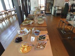 ケーキ棚には素朴なスイーツが並んでいました。喫茶の提供もあり外のテーブル席でいただくことも可能なよう。しかし今はお腹がいっぱいだ…、残念。