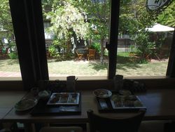 比較的すいていたので席は選び放題。さっきの満開の藤の花が良く見える席を確保してお腹も目も同時に満たせる事に ♪